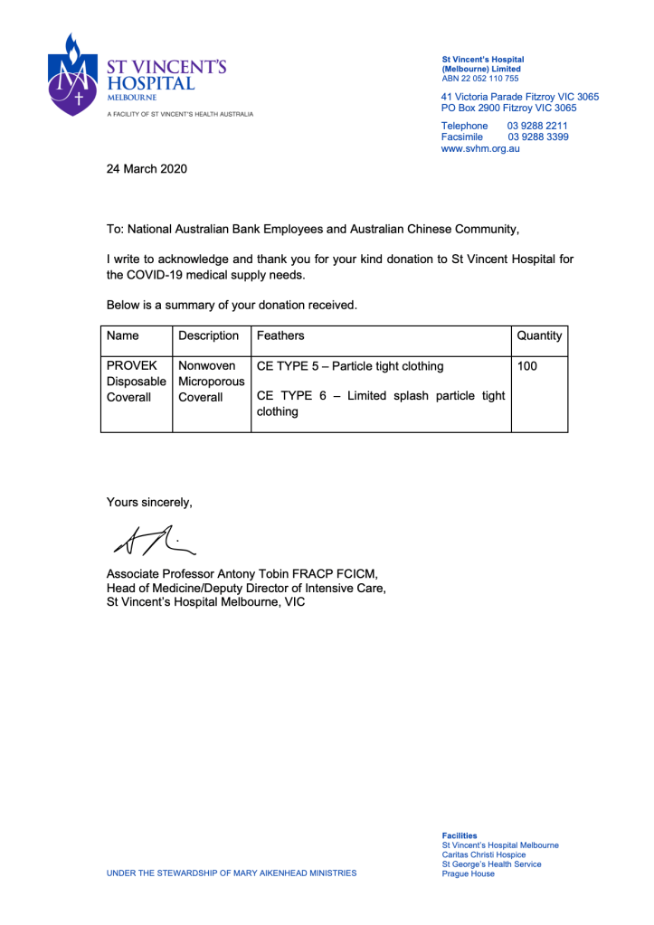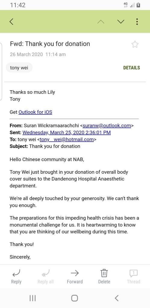 我们购买的第二批防护服现在陆陆续续在捐给墨尔本医院: